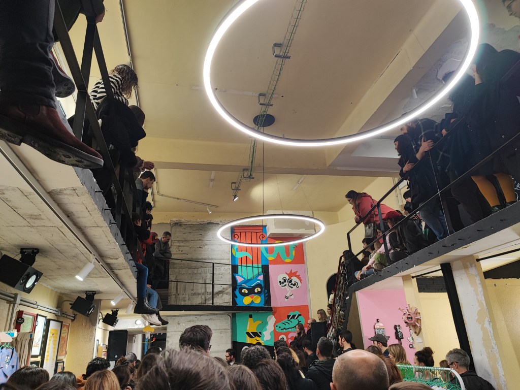 O comisario da exposición, Raúl Bermúdez, foi o encargado de entrevistar á autora na presentación do libro. A entrevista sentiuse máis ben coma unha charla distendida entre amigos, coma un capítulo de Domingo de Bajón (o podcast de Flavita e Ricardo Moya en Podimo) no que no canto de estar Ricardo, aparece Raúl. A galería estaba abarrotada de xente, cos cristais embazados polo contraste entre a incesante choiva galega do exterior e a multitude concentrada no interior. Un público atento e entregado que deixaba escapar gargalladas de vez en cando pero sen interromper nunca a conversa.