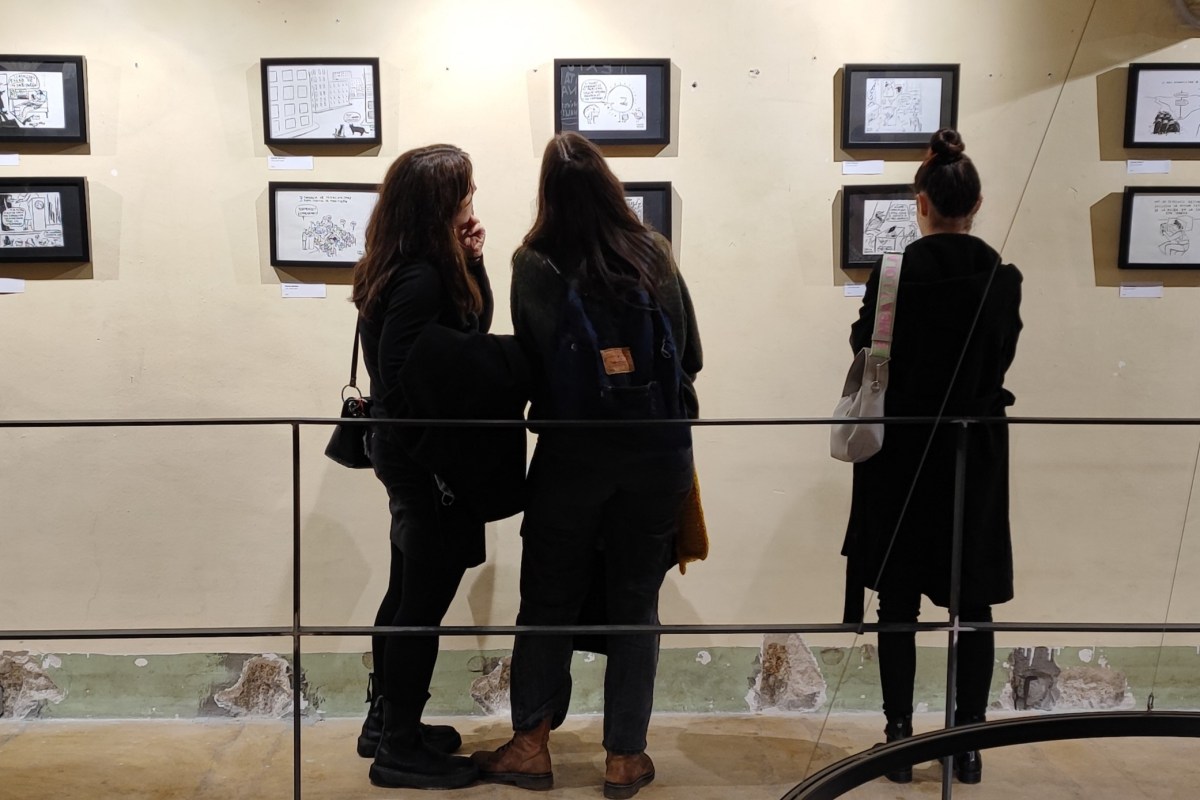 O comisario da exposición, Raúl Bermúdez, foi o encargado de entrevistar á autora na presentación do libro. A entrevista sentiuse máis ben coma unha charla distendida entre amigos, coma un capítulo de Domingo de Bajón (o podcast de Flavita e Ricardo Moya en Podimo) no que no canto de estar Ricardo, aparece Raúl. A galería estaba abarrotada de xente, cos cristais embazados polo contraste entre a incesante choiva galega do exterior e a multitude concentrada no interior. Un público atento e entregado que deixaba escapar gargalladas de vez en cando pero sen interromper nunca a conversa.