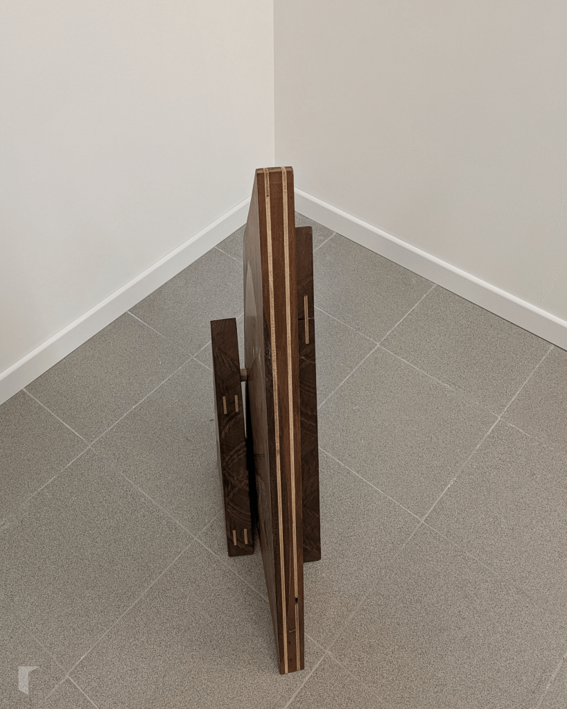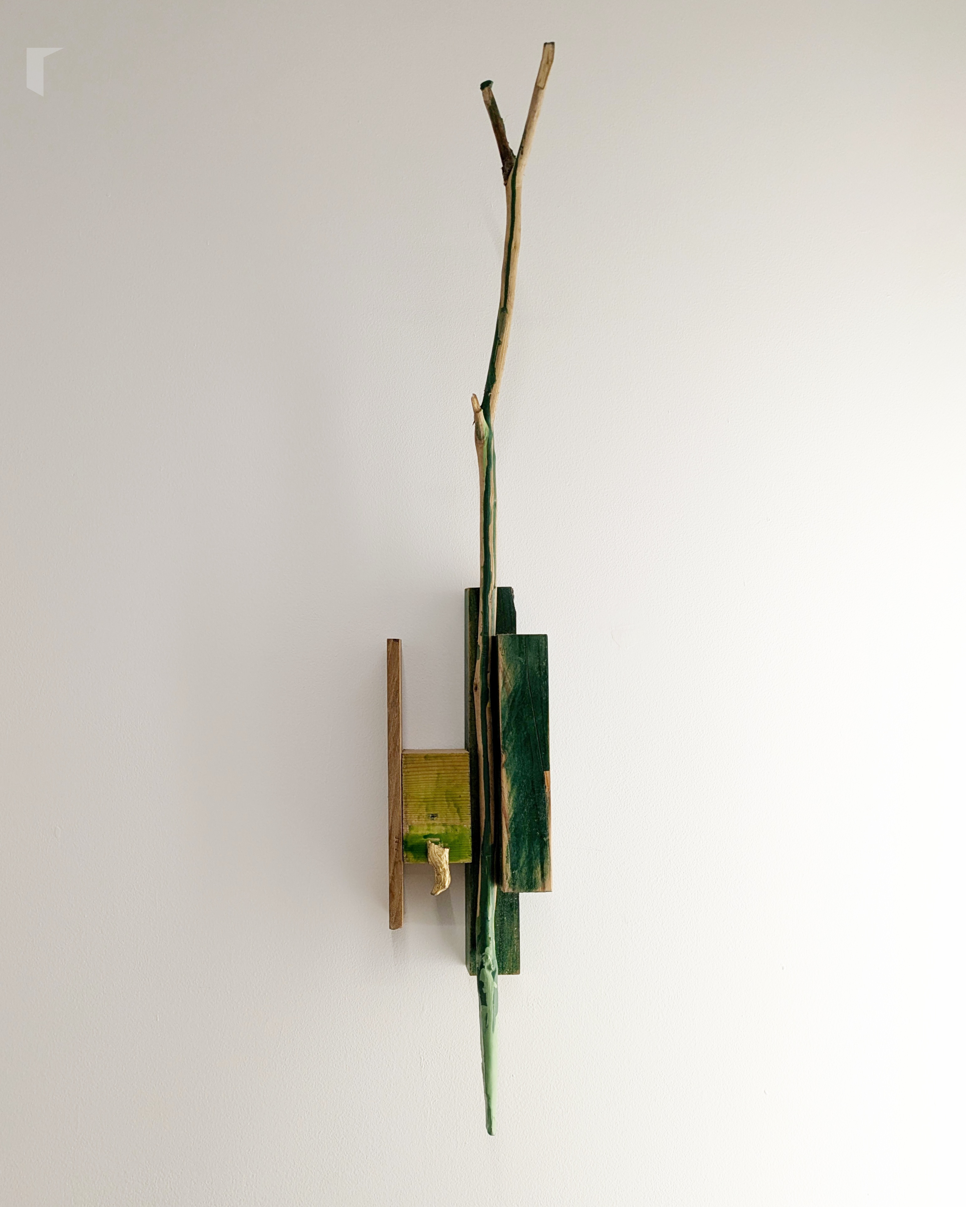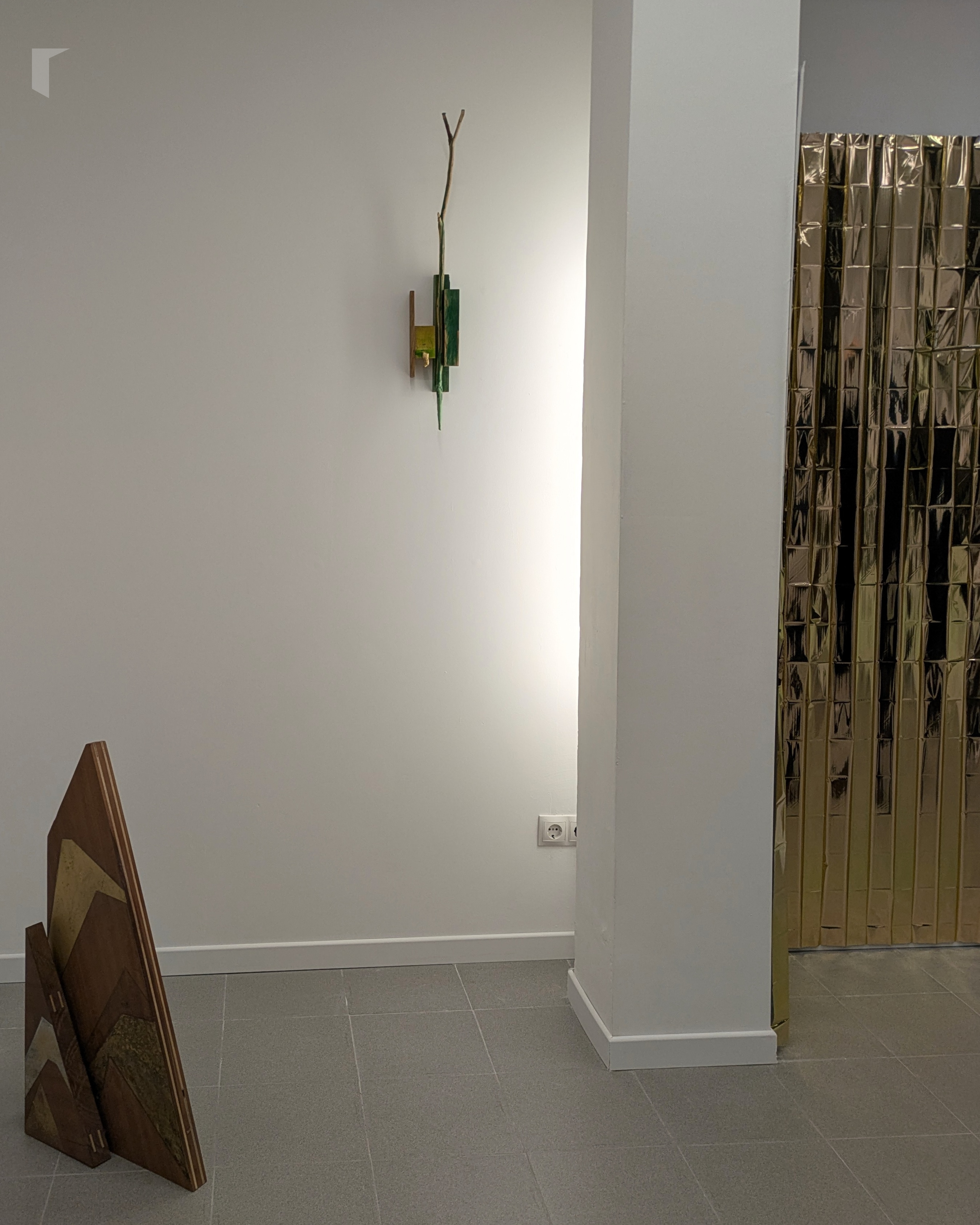 Alzando a vista chegamos a Paisaxe “freelance”, que pende coma un trofeo de caza non violento, paisaxe primixenia que recolle nunha lixeira ensamblaxe hectáreas e hectáreas de bosque. Falei con Paula sobre esta peza, da que me contou que é a máis antiga das que podemos observar na mostra e que é o perfecto exemplo do traballo de Villamide, de como o artista combina restos industriais e orgánicos para crear outras paisaxes posibles. Como apunte especial, contoume que ao observar a peza con mimo e atención a ollada repara nunha tablilla de madeira cun debuxo feito polo fillo de Christian cando era neno, un detalle reservado para o espectador pausado, que saborea e dialoga con cada peza. Artista, comisaria e galerista invitan a unha ollada atenta, a observar con detenemento, a pousarse sen présa. En palabras de Alba: