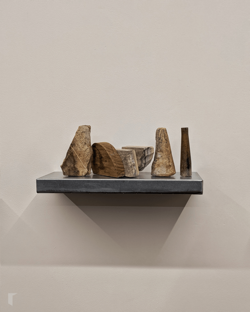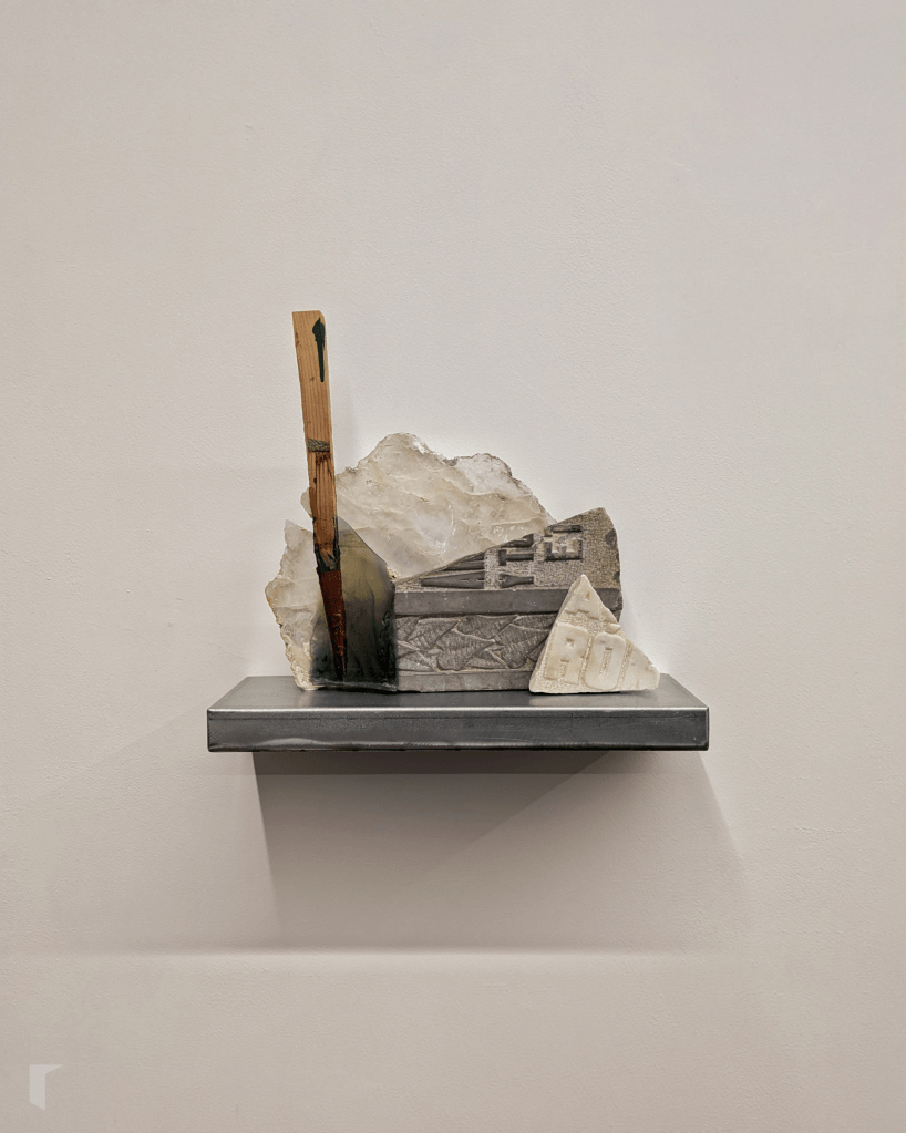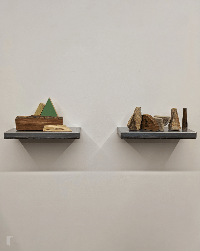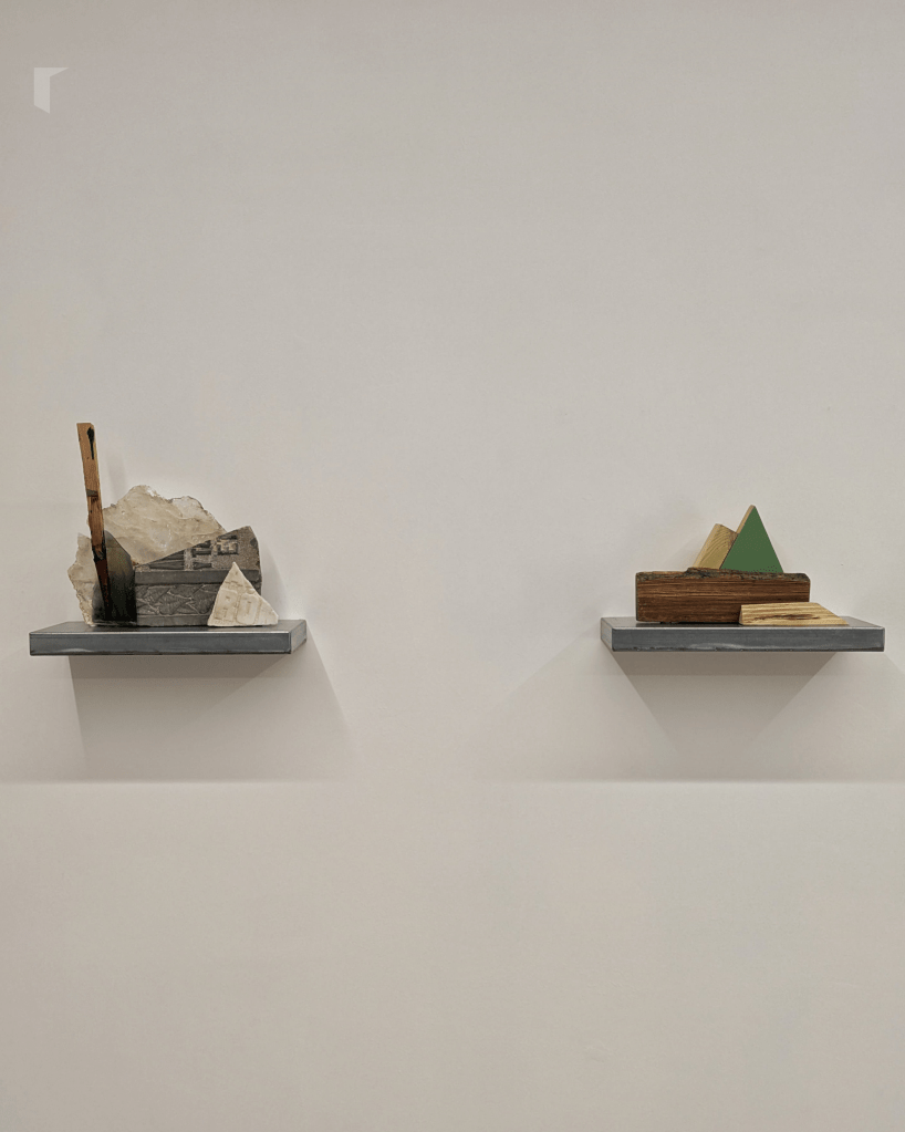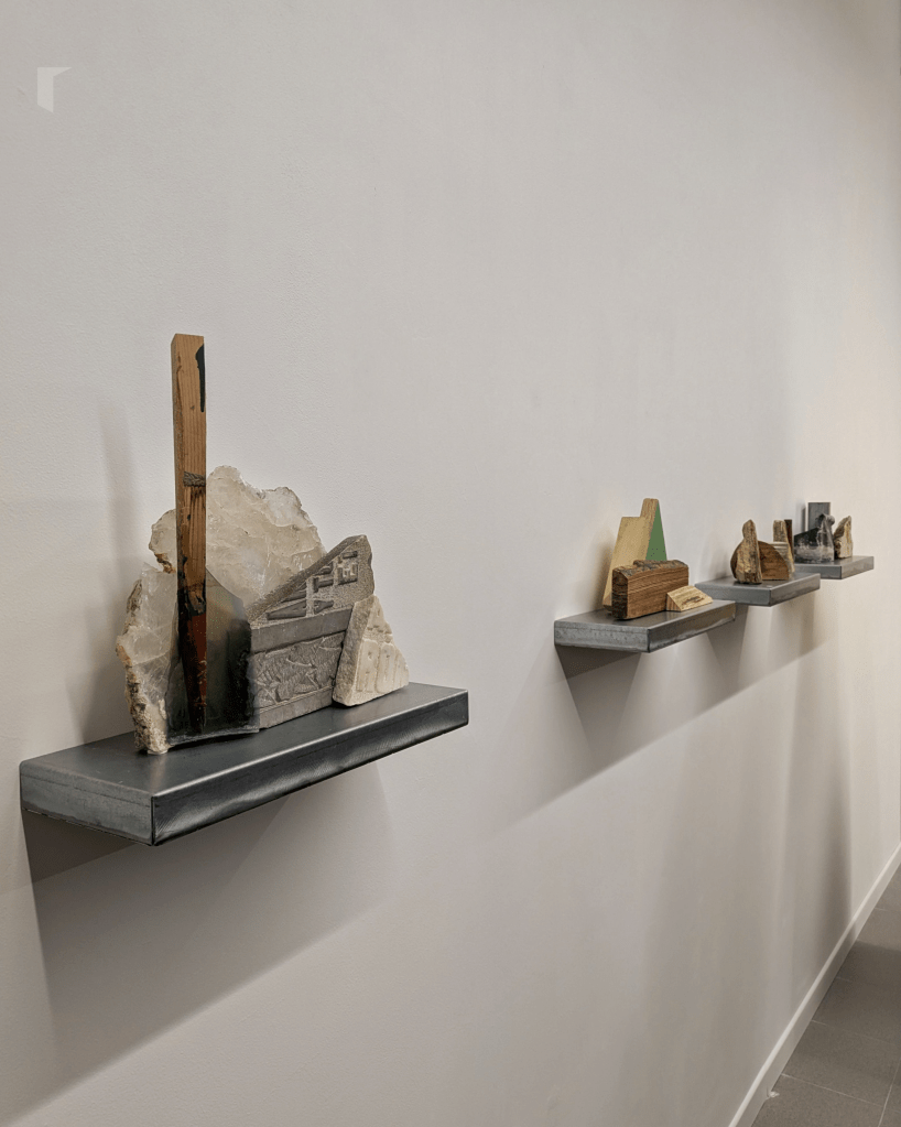 Precisamente estes últimos son os protagonistas da serie que ocupa a parede principal da galería. Sobre catro peanas repousan as Poéticas do desescombro do artista lucense, construídas con restos de madeiras, metais e rochas; erixidas con escombros que deixan de ser resto para formar un novo todo baixo a dirección de Christian, que as resignifica ao dispoñelas evocando cordilleiras, serranías e macizos.