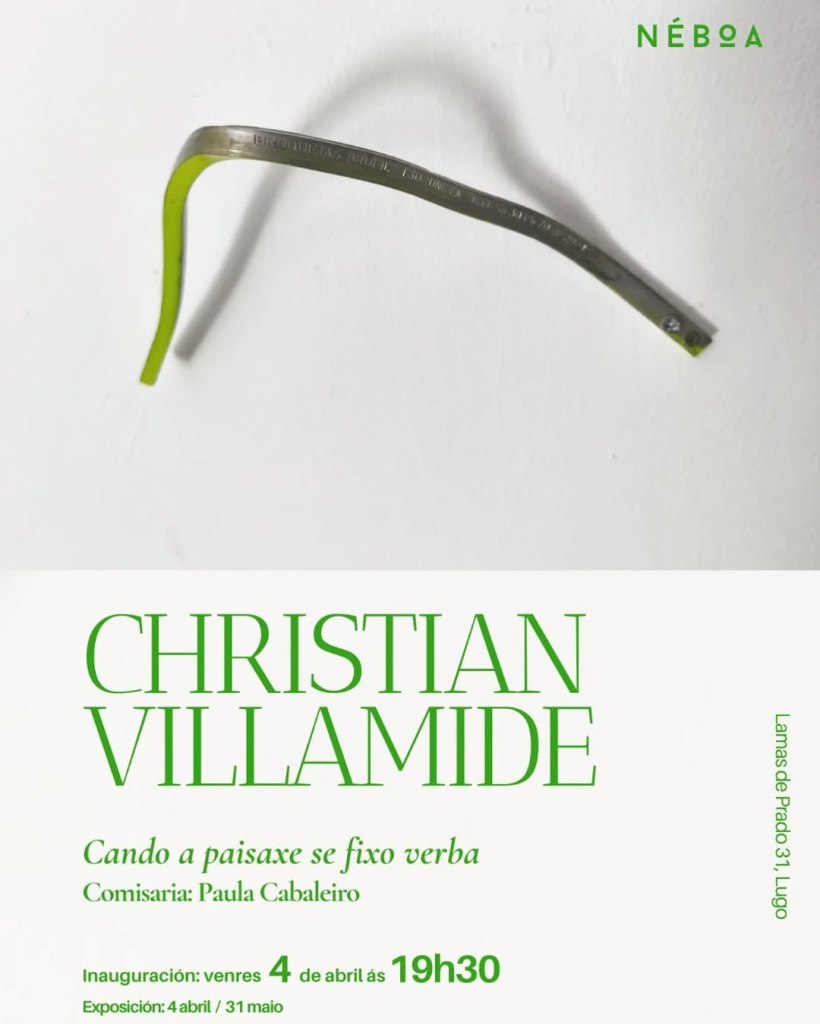 O pasado 4 de abril inaugurouse na galería Néboa Cando a paisaxe se fixo verba, exposición individual de Christian Villamide comisariada por Paula Cabaleiro. Tras case unha década sen expoñer na súa cidade natal, o artista lucense regresa á súa casa coa comodidade de estar no fogar e a emoción de entrar nun espazo novo. Esta mostra é ao tempo un retorno e un comezo, xa que esta é a primeira vez que Villamide expón en NÉBOA, galería fundada en 2023 por Alba López Porto no barrio da Milagrosa, no número 31 de Lamas de Prado, en Lugo.