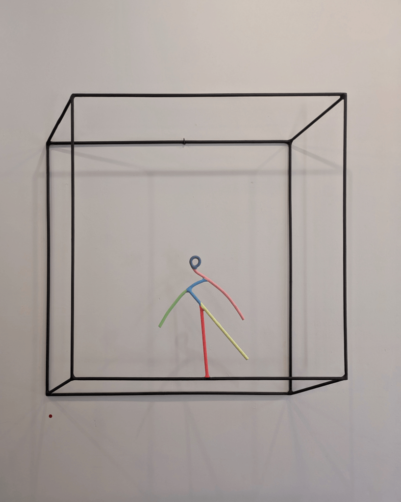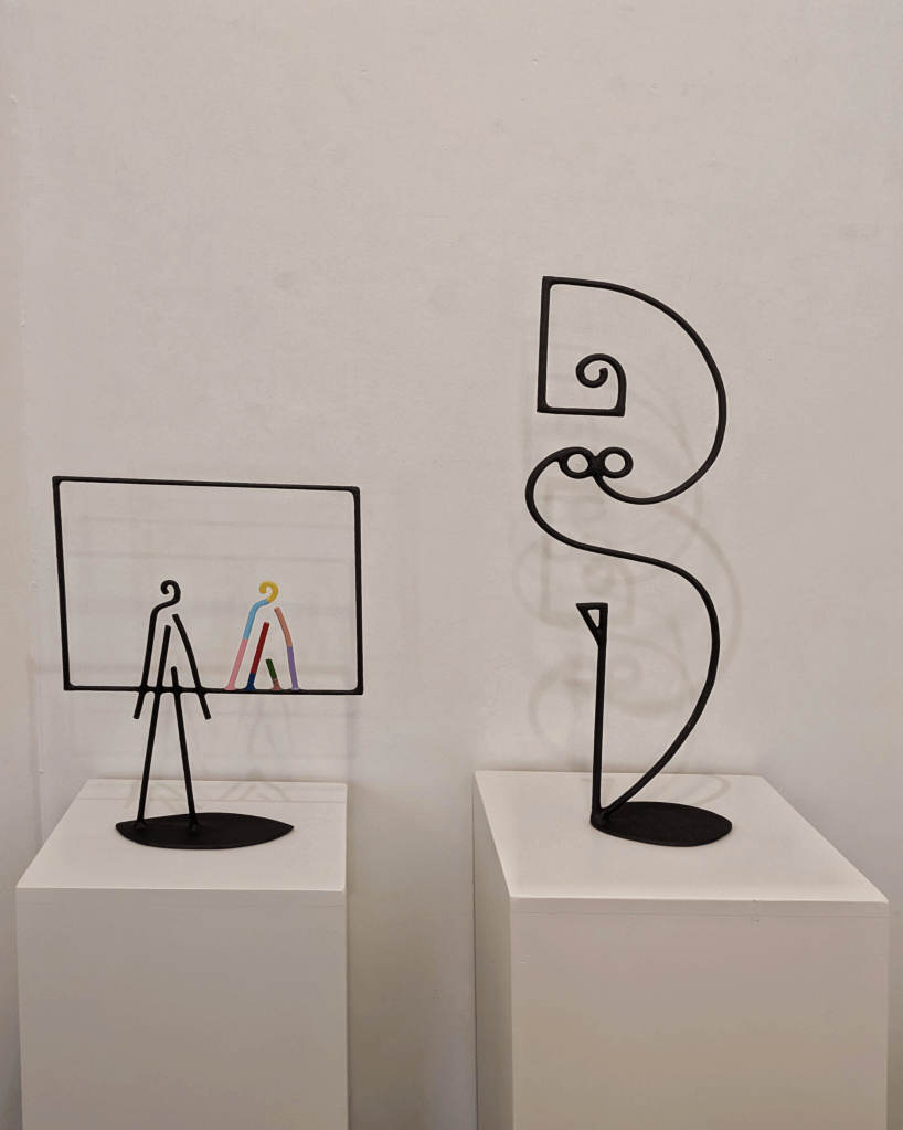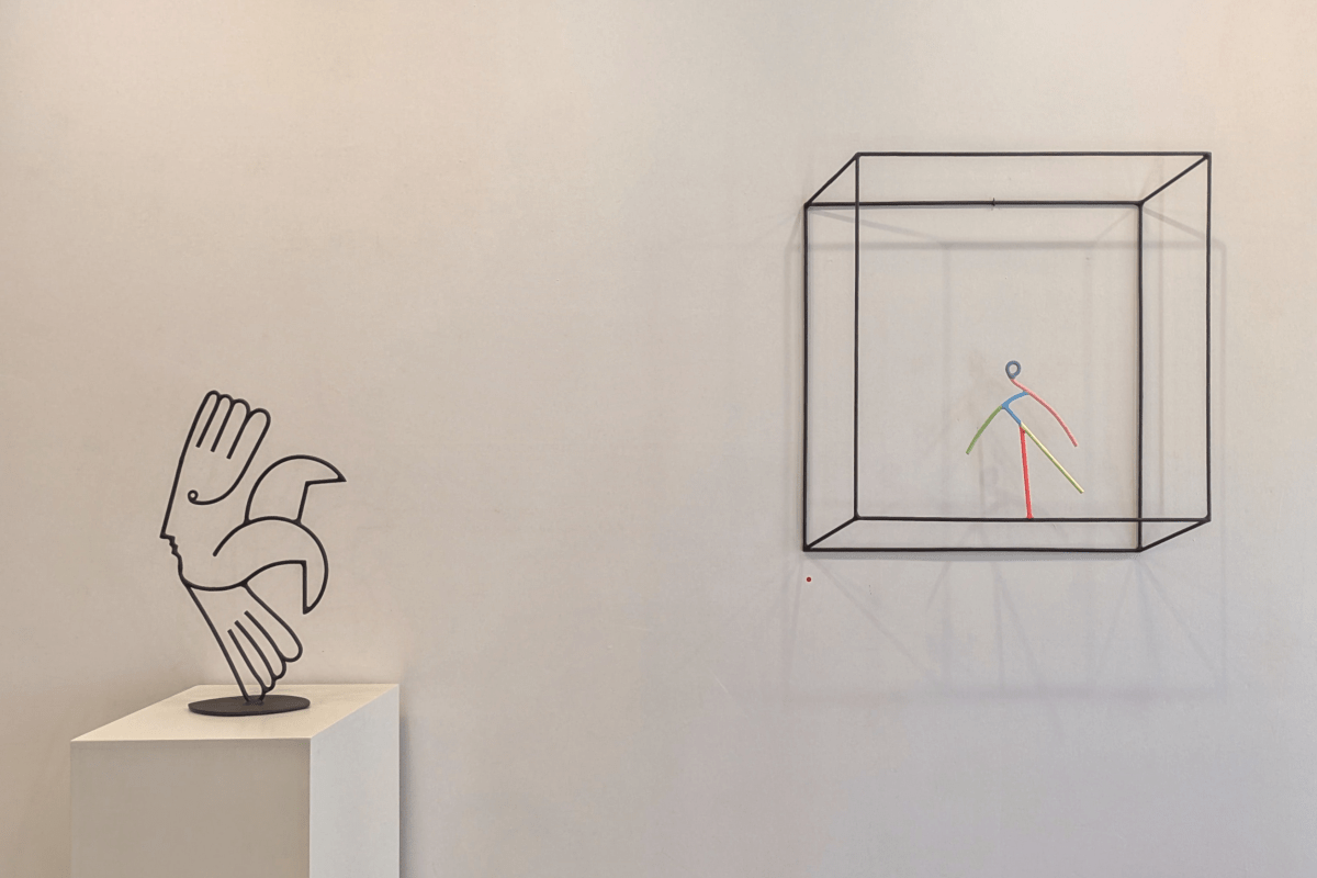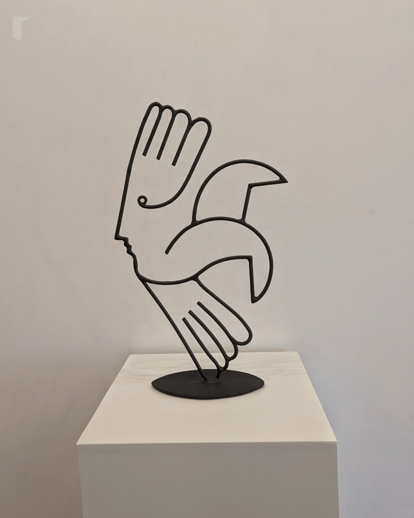 Dupla convírtese nunha destas follas ateigadas de personaxes con Endless Game, unha mostra divertida, lixeira e case onírica que podería lerse coma unha esquemática biografía do artista, coma unha poesía visual sobre o seu romance coa liña e o espazo. Desde a rúa vemos o móbil que conforman Máscara e Luna, dúas follas de aceiro que penden despreocupadas, livianas, xoguetonas. A luz rebota na súa superficie plateada e reflíctese no exterior invitando aos transeúntes a seguila, faro ata a galería, manto de estrelas-guía.